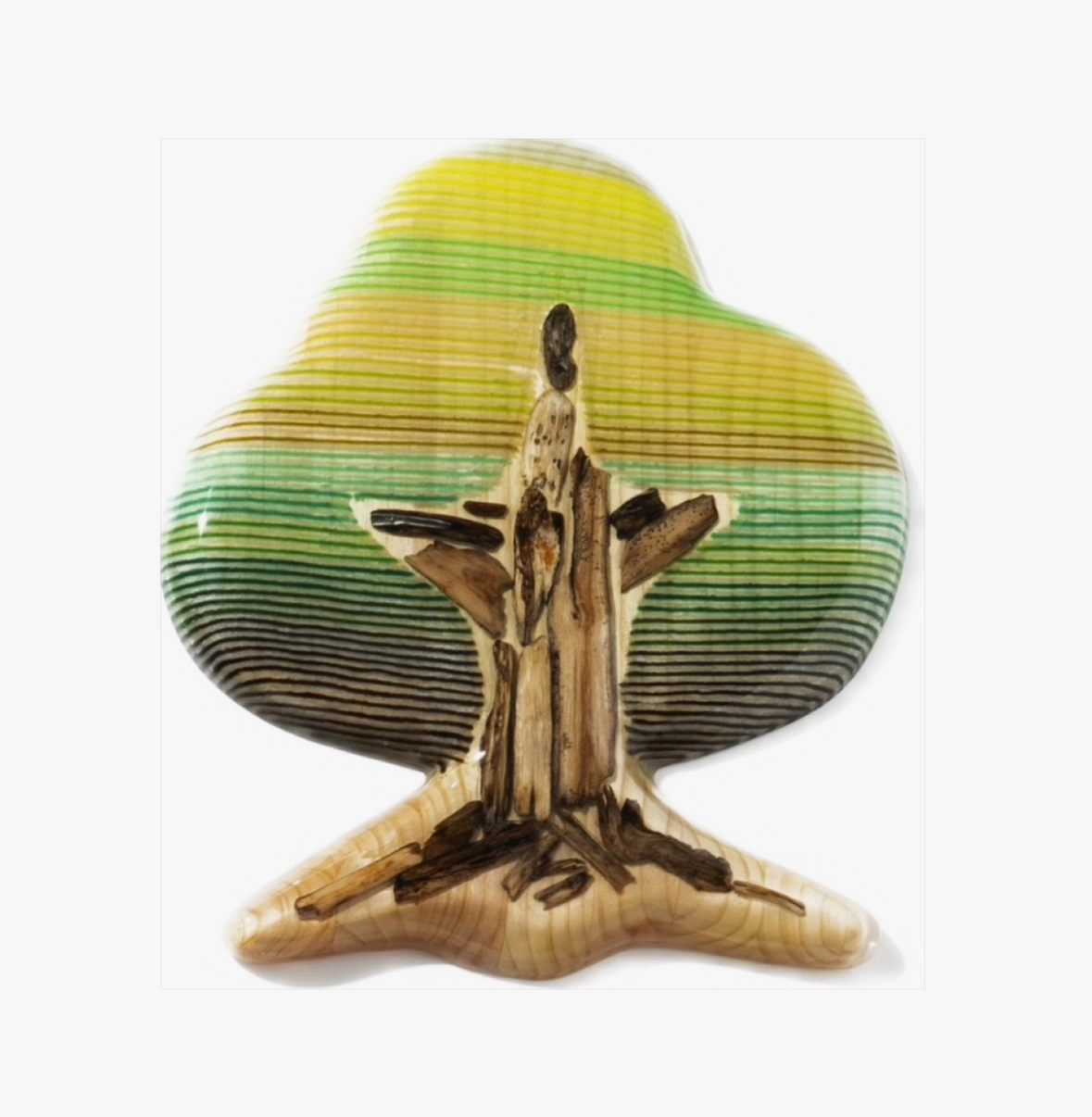 自身と縁の深い海をモチーフに作品を発表してきたhi-dutchは、毛糸や海のごみを木材に貼り付け、樹脂でコーティングして磨き上げる技法で知られています。樹脂に包まれた木の温もりと毛糸の優しさが調和し、作家の手によってマテリアルの新しい顔が浮かび上がる様子は、一度忘れ去られた記憶が再び甦るかのように、素材の本質や過去に触れる感覚を私たちに想起させます。10代の頃からサーフィン文化に親しんできた作家は、自宅で忘れ去られていた毛糸に目を留めたことをきっかけに、サーフショップでのサーフボード修理で培ったレジンや樹脂を用いたリペア技術を活かし、毛糸や海のプラスチックごみ、流木を再利用したアート作品を制作し始めました。ものとしての情報を失い、イメージやアイデンティティが曖昧になったマテリアルが、作品制作の過程で素材としての意味を取り戻していく姿は、私たちと素材との純粋な関係を思い起こさせます。世代を超える普遍的なノスタルジーを喚起させるモチーフにかたどられた木材に糸を有機的に重ねることで、素材と観る者の私的な記憶が交錯します。