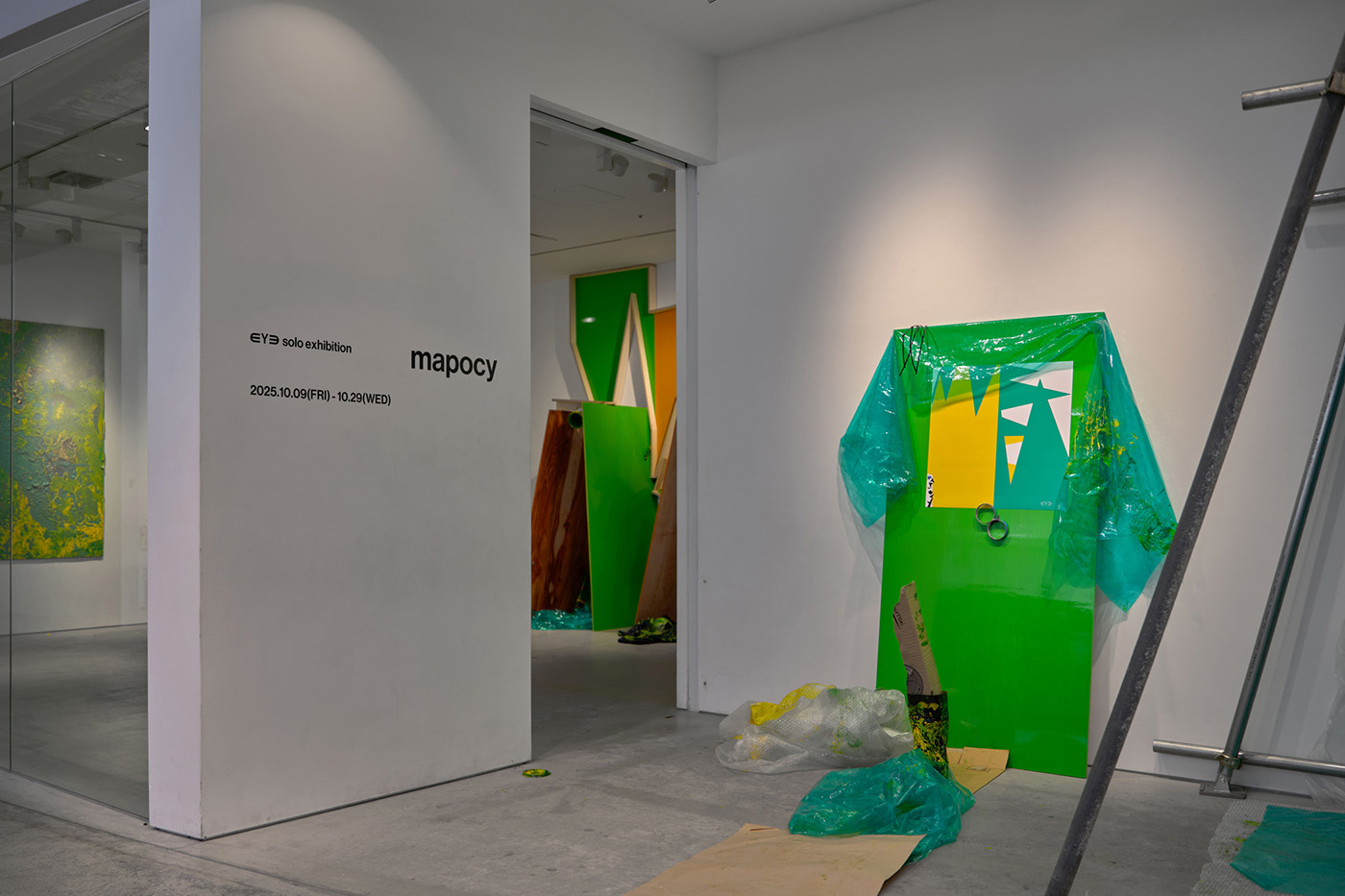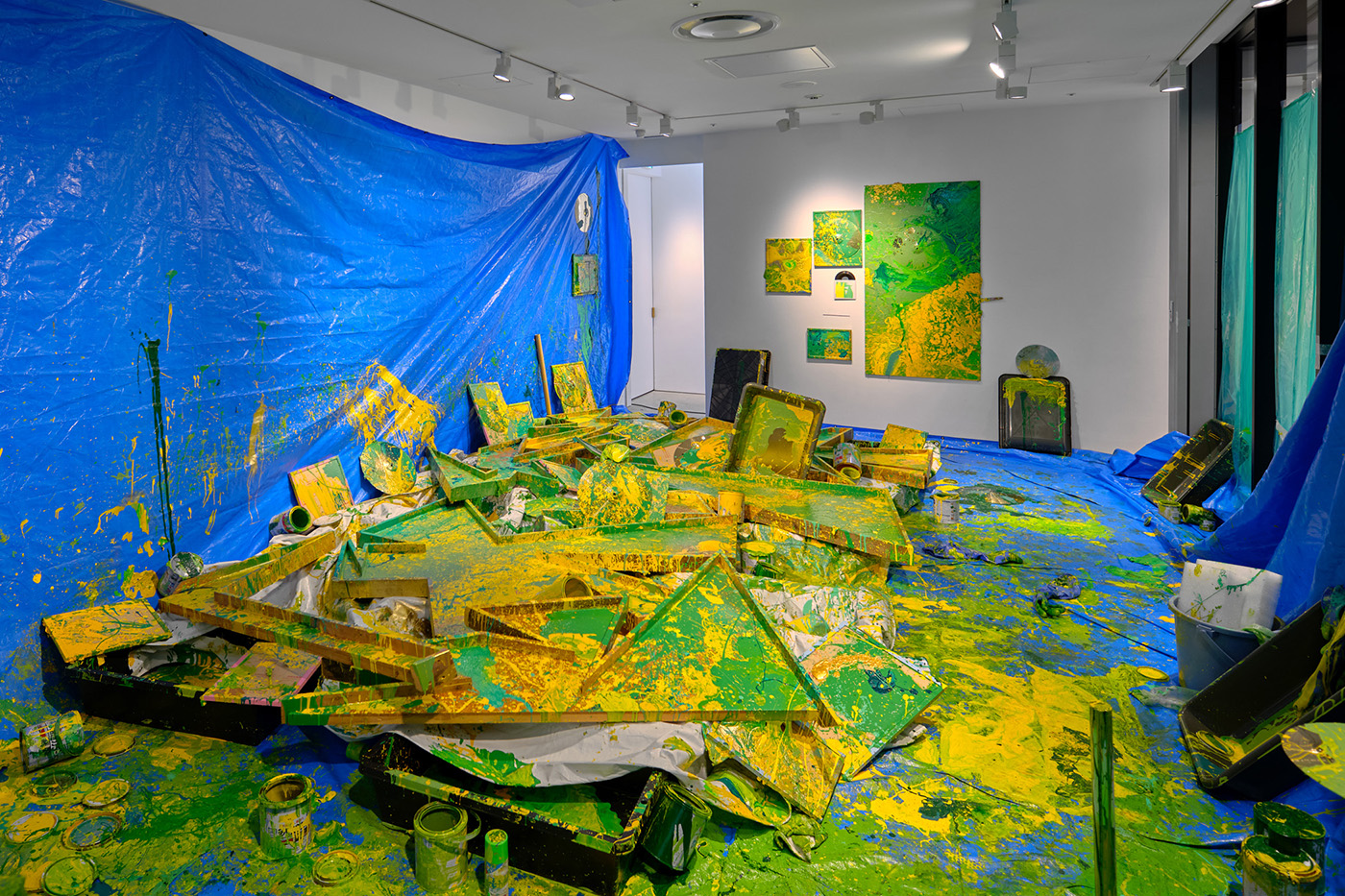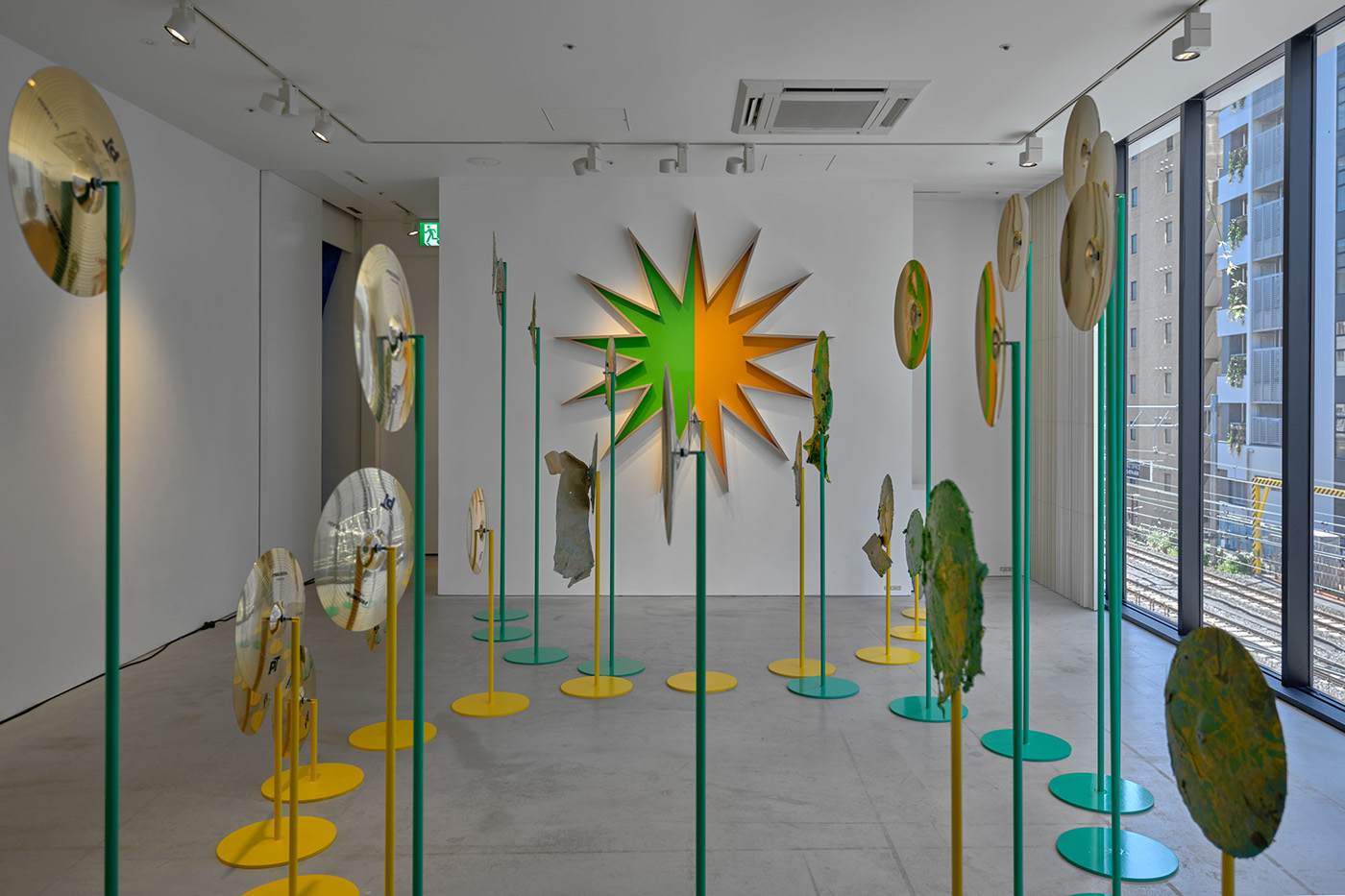 Through sound, performance, and visual works, ∈Y ∋ has consistently presented alternative ways of perceiving the world around us. In this exhibition, green and yellow—the standard colours of plywood (conpane)—are employed as a medium, giving rise to a new world inspired by automata theory and cellular automata. Using LEDs, cymbals, and large wooden frames (popcorn), the spatial installation sees matter, sound, and light, entering into mutual relations, where concepts such as time, synchronisation, and states intricately interweave. Like a mandala, the work unfolds in layered complexity, inviting visitors to experience an emergent new world.